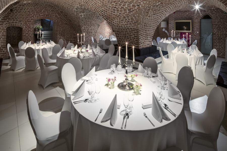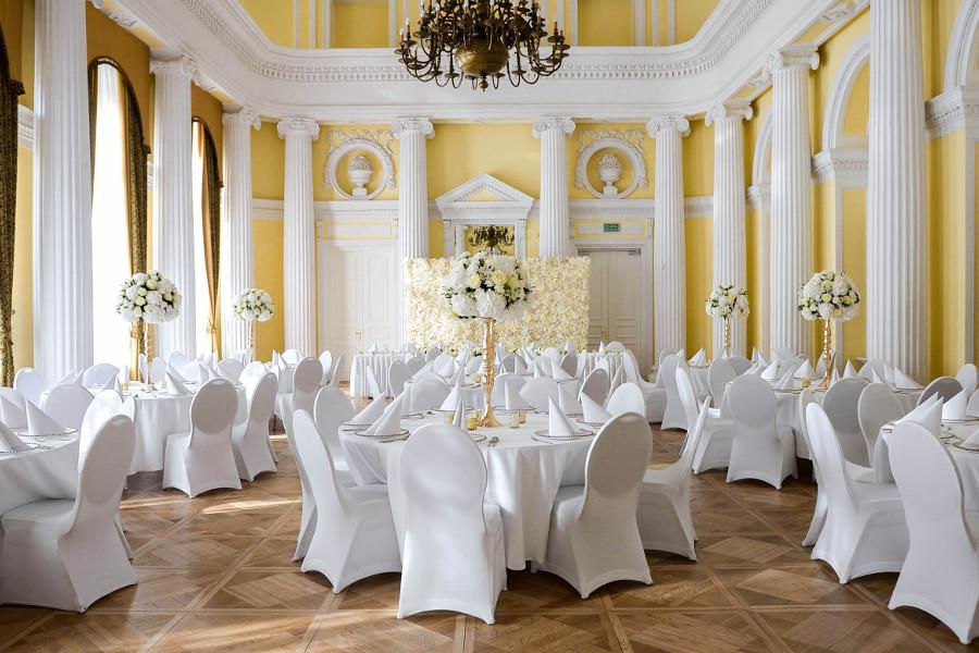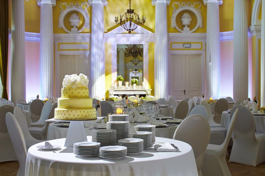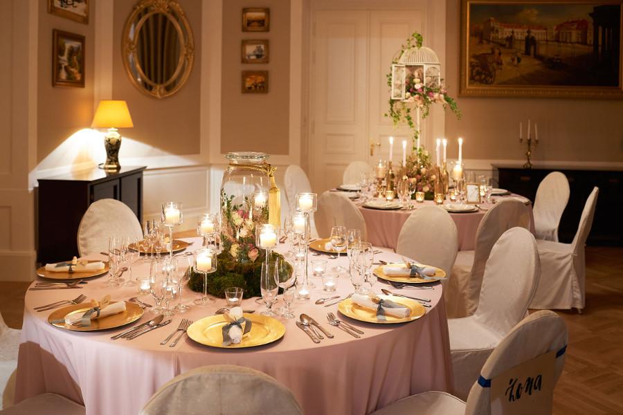 W Sali Kolumnowej rozmieszczone są okrągłe stoły, przy których zasiadają zaproszeni goście. Taki kształt stołów nadaje przyjęciu bardzo klasyczny i elegancki charakter. W centralnej części Sali znajduje się prostokątny stół Pary Młodej. Całości dopełniają dodatkowe podświetlenia architektoniczne kolumn i kominków w Sali Kolumnowej oraz ścian i wnęk okiennych w Sali Marmurowej. Oświetlenie architektoniczne jest niezwykle efektowne i podkreśla klasyczny wygląd pałacowych wnętrz.