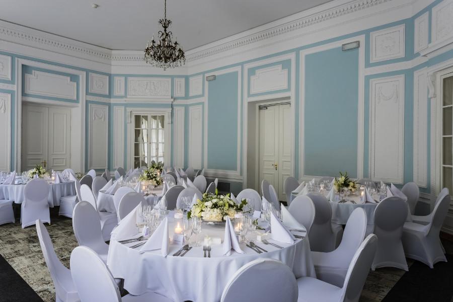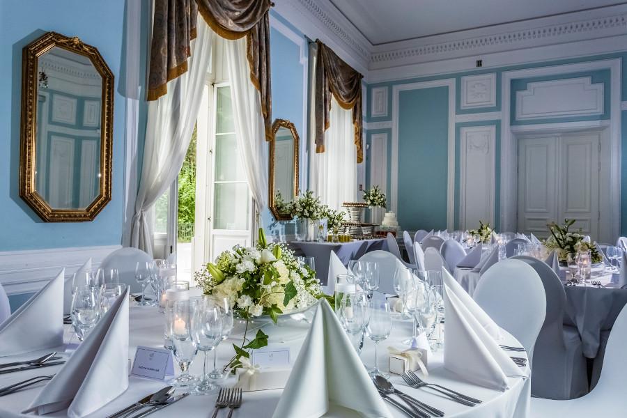 Sale Żółta, Niebieska i Malinowa zachwycają piękną sztukaterią i przepięknym widokiem na rozległy ogród. Dodatkowym atutem Sali Niebieskiej jest wyjście na ogród.